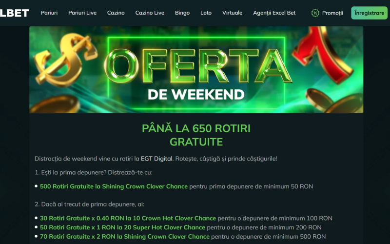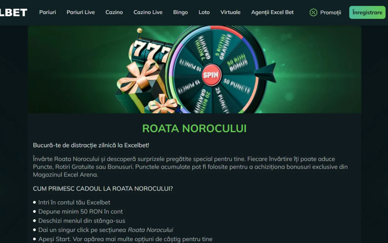 Platforma poate oferi uneori un Excelbet bonus fara depunere. Acesta este un mijloc excelent de a încerca jocurile de cazinou sau pariurile fără a risca banii tăi. Acest tip de Excelbet bonus fara depunere vine adesea sub forma unei mici sume de bani bonus sau a unor rotiri gratuite la sloturi specifice. Cea mai bună metodă de a începe să te familiarizezi cu site-ul este aceasta.